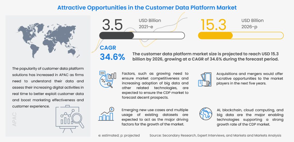 And hardly any platform enables businesses to squeeze every last ounce of value from customer data like a Customer Data Platform (CDP). Therefore, it comes as no surprise that the global CDP market, worth $3.5 billion in 2021, is projected to grow 5x at a compound annual growth rate (CAGR) of 34.6% by 2026.