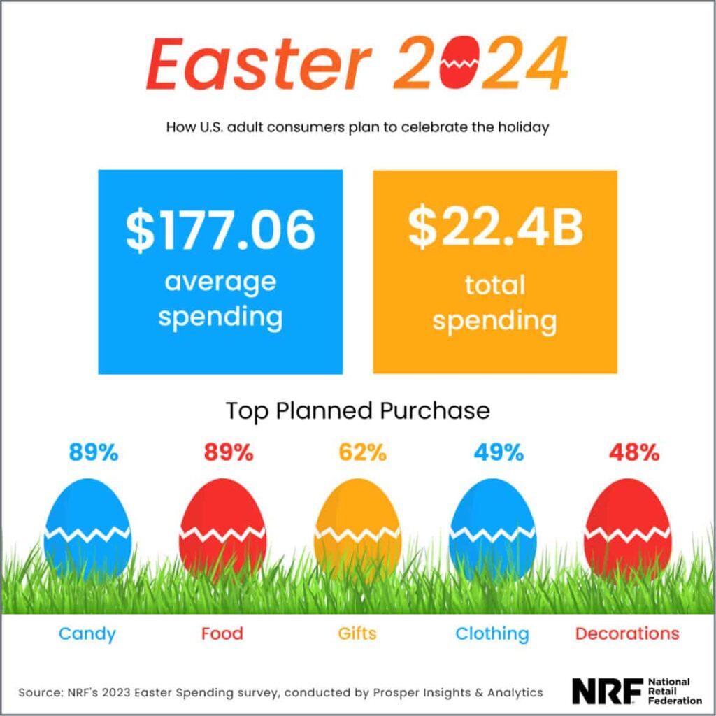 As we gear up for Easter 2024, the retail landscape is poised for a whirlwind of spending, with American consumers projected to splurge a staggering $22.4 billion, according to the latest insights from the National Retail Federation and Prosper Insights & Analytics. Consumers are gearing up to invest heavily in a variety of categories diving headfirst into the delicious realm of food and candy, gifts, clothing, and decorations. It’s clear that Easter is a retail extravaganza.