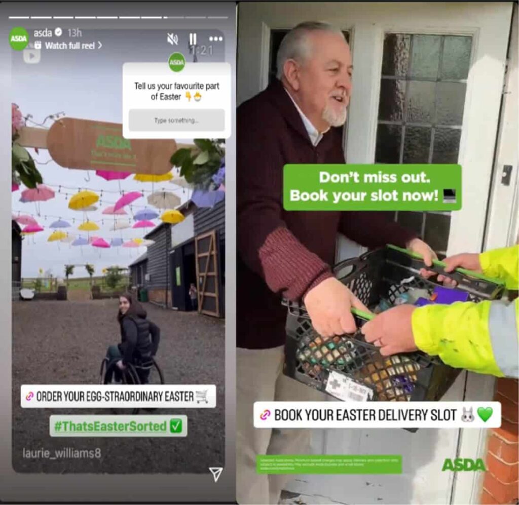 Strategy: Asda has launched its 2024 Easter advertisement where it imagines a farm where chickens lay chocolate eggs. As part of its Easter campaign, Asda is hosting an “open farm” family fun day, accompanied by a competition for a chance to win an overnight stay in a luxury farmhouse. Embracing the farm theme, Asda is engaging its audience on social media with the hashtag #ThatsEasterSorted and partnering with brands, encouraging participation through interactive polls. To cater to families during the holiday, Asda is offering customers to book Easter delivery slots.