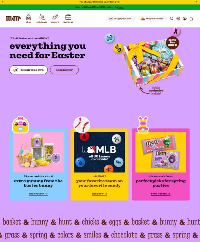 Strategy: Mars unveiled its 2024 Easter campaign with the launch of M&M’S Easter Sundae candies. Alongside this release, M&M’S also introduced its 2024 Easter Gift Guide. Shoppers can explore a variety of personalized gifts, ranging from iconic candy options to merchandise featuring beloved M&M’S characters. With over 20 M&M’S colors to choose from and the option to add customized messages and images, the possibilities are endless.