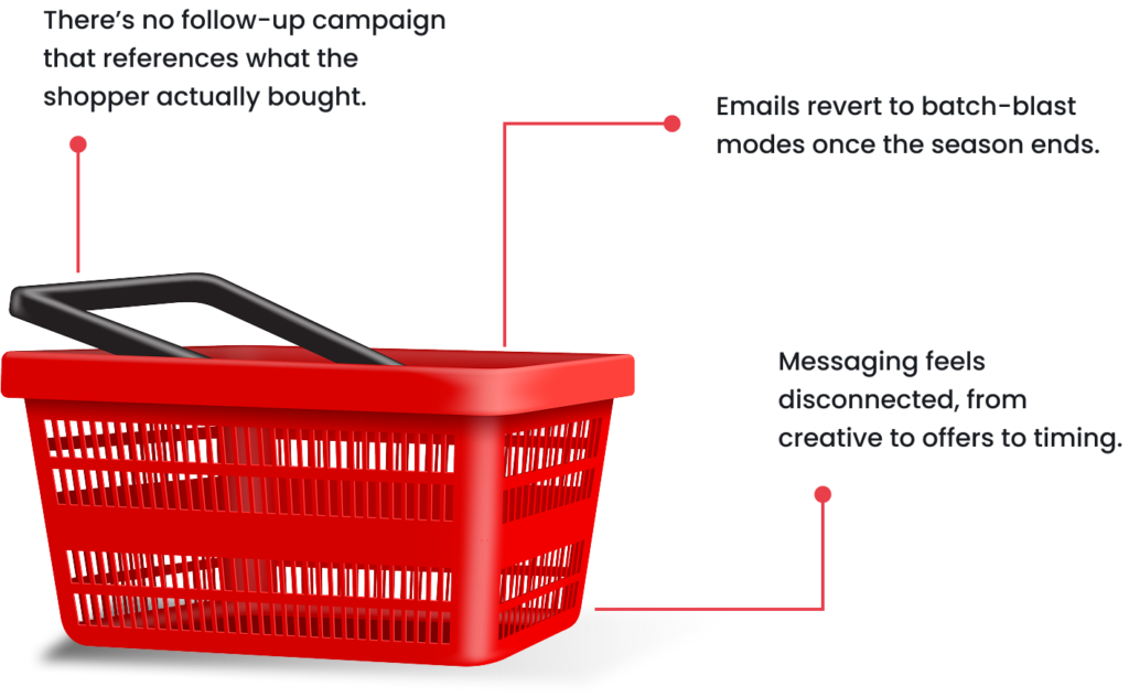 The holiday purchase and intent aren’t stitched into dynamic content logic early enough