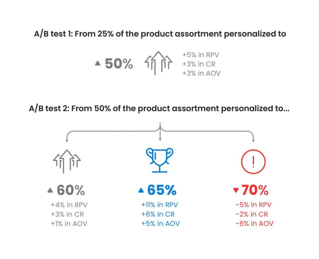 One of our clients found their sweet spot at 65%, and discovered that increasing personalization to 70% on their commerce store resulted in a 5% drop in revenue per visitor and 6% lower average order value.