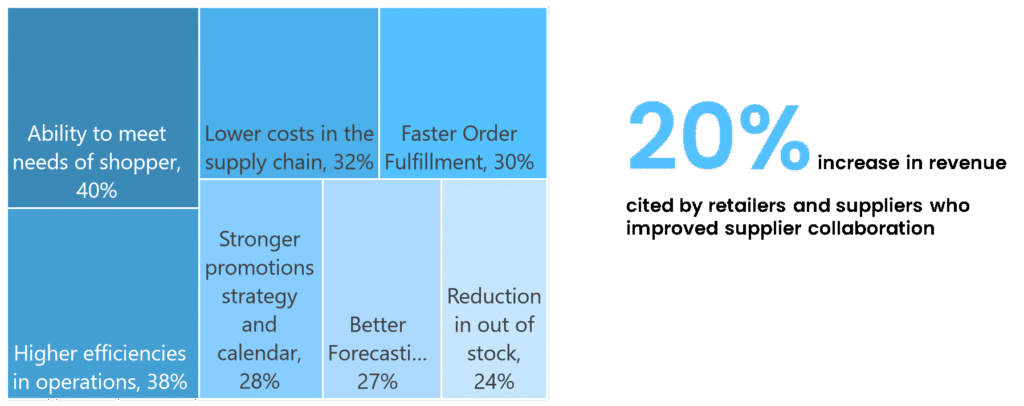 Moreover, retailers who invested in improving supplier collaboration have seen a 20% increase in revenue directly or indirectly, according to the Coresight Research survey of retailers, by Precima. Among some of the direct benefits received by these firms are lower costs in the supply chain (32%), faster order fulfillment (30%), and stronger promotions strategy and calendar (28%).