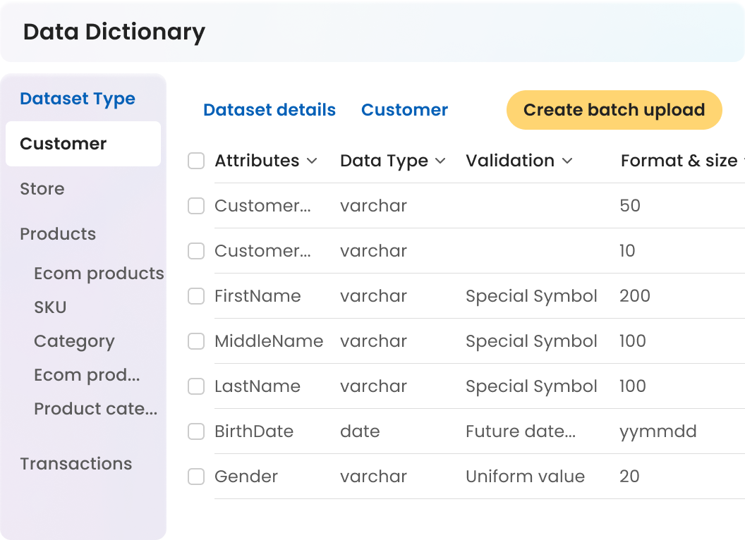 Enjoy the transparency of data access with a consolidated view in the Data Dictionary. Customer data attributes are aggregated, validated, and standardized into a template for structured storage in a Data Warehouse for direct batch upload.