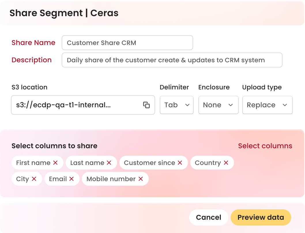With a simple UI, seamlessly export customer data and segments to S3 location for personalization, cross-channel marketing campaigns, targeted advertising, and other use cases. You could choose bulk file export or real-time activation with published APIs.