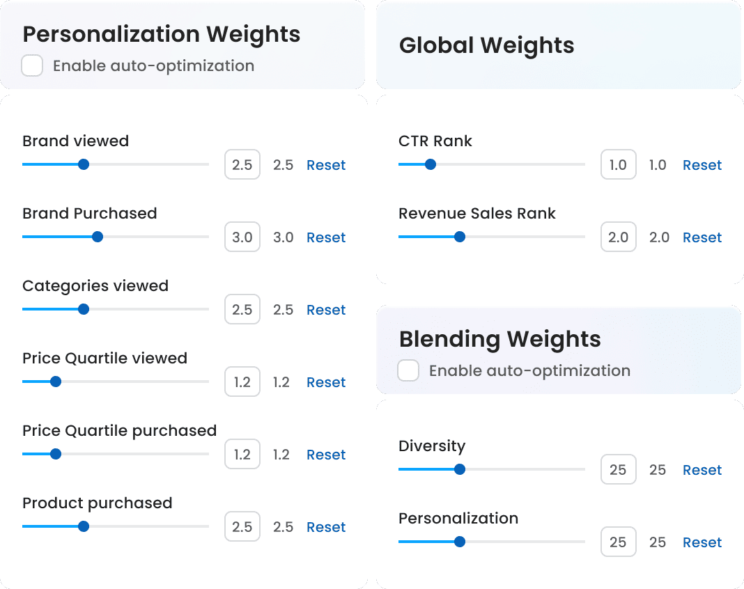 Customize the importance placed on different attributes, including product, price, newness, brand, category affinities, etc.