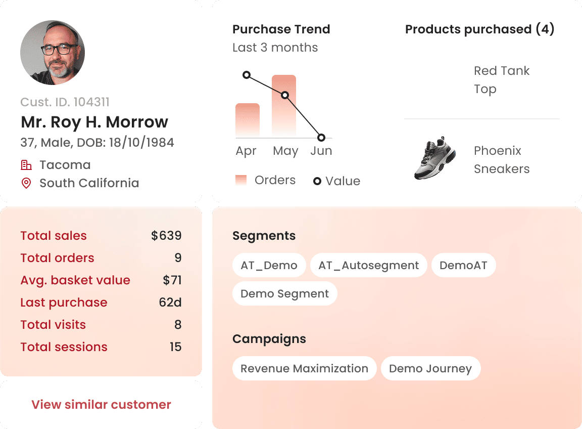 Stitch together known logins with anonymized user identities using deterministic and probabilistic algorithms. Get a comprehensive, real-time view of the customer, complete with demographic data, purchase history, interests, activity timeline, and more. Create a list of customers similar to your chosen profile for campaigns.
