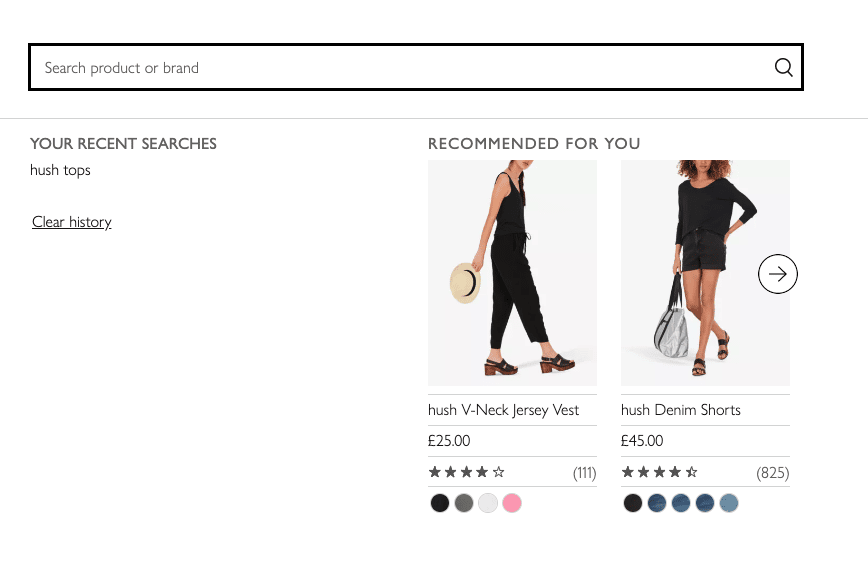 Product and category recommendations are placed in search boxes based on the user’s recent searches.