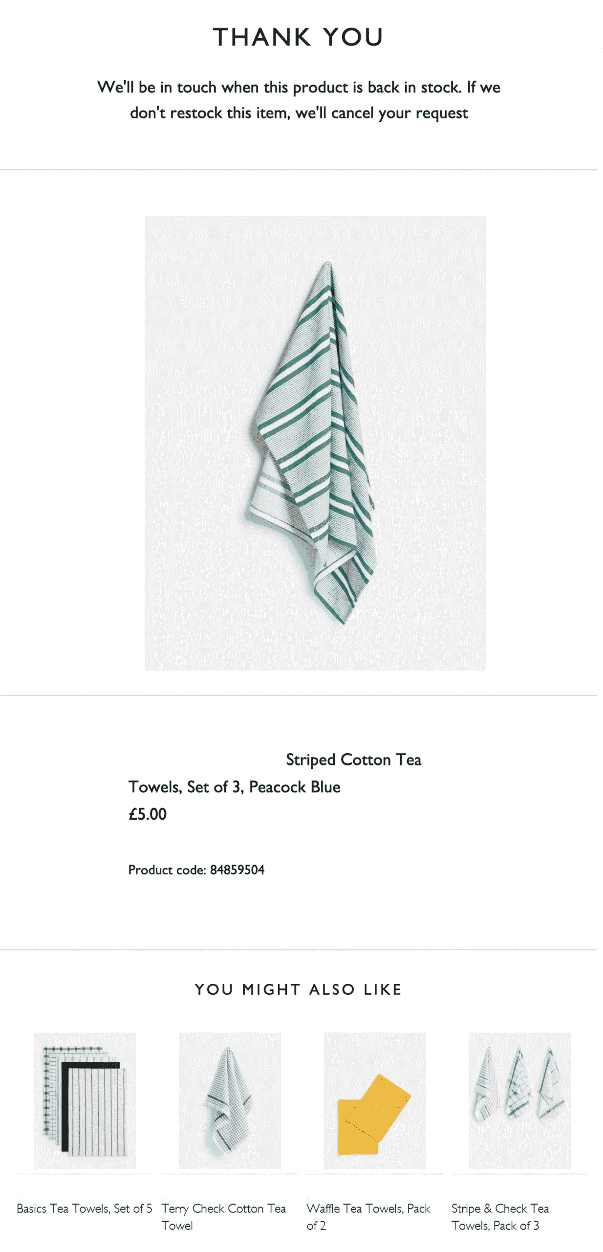 When a customer signs up for notifications for products that are out of stock on the website, the client runs an email campaign around it. These emails contain not just alerts about the product in question but also recommends alternatives and similar products they could consider instead. The same strategy is also used on the website, where alternatives to out-of-stock products are shown in a panel on the product page.