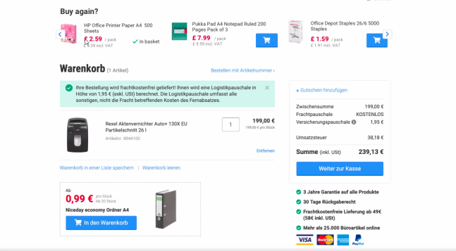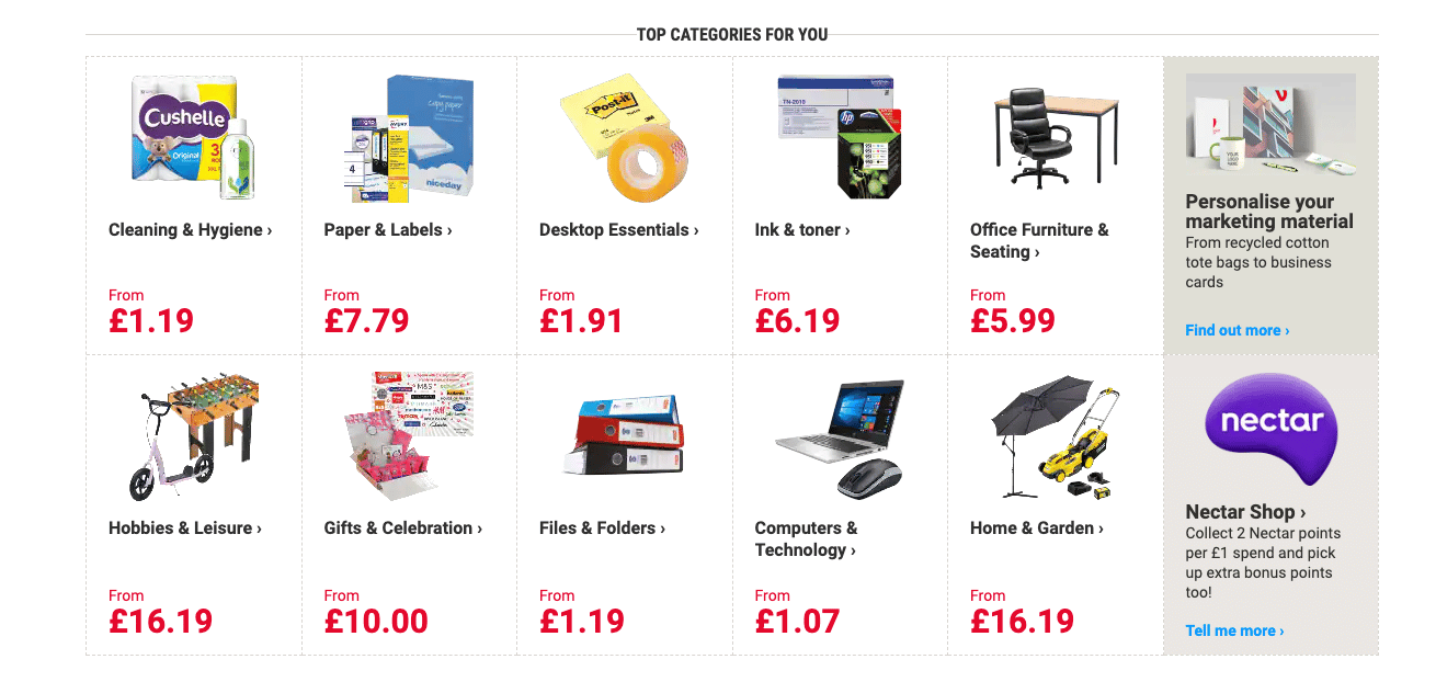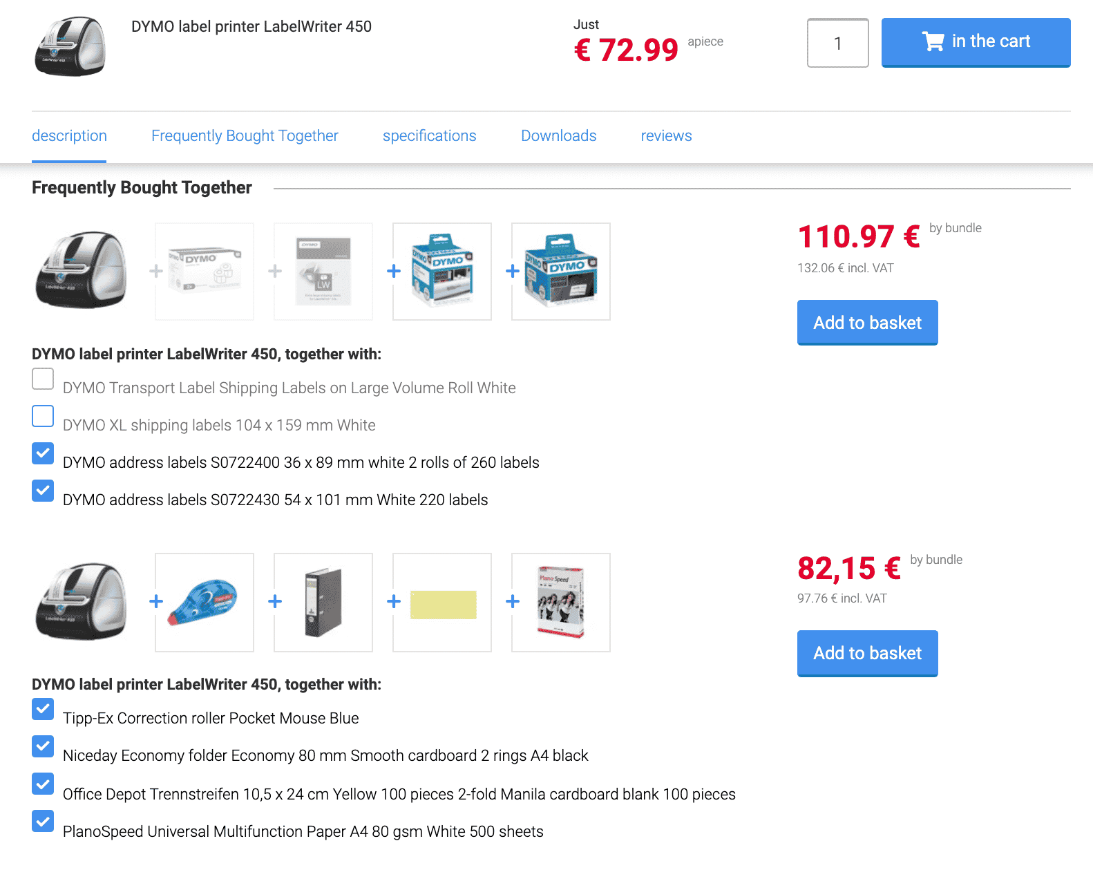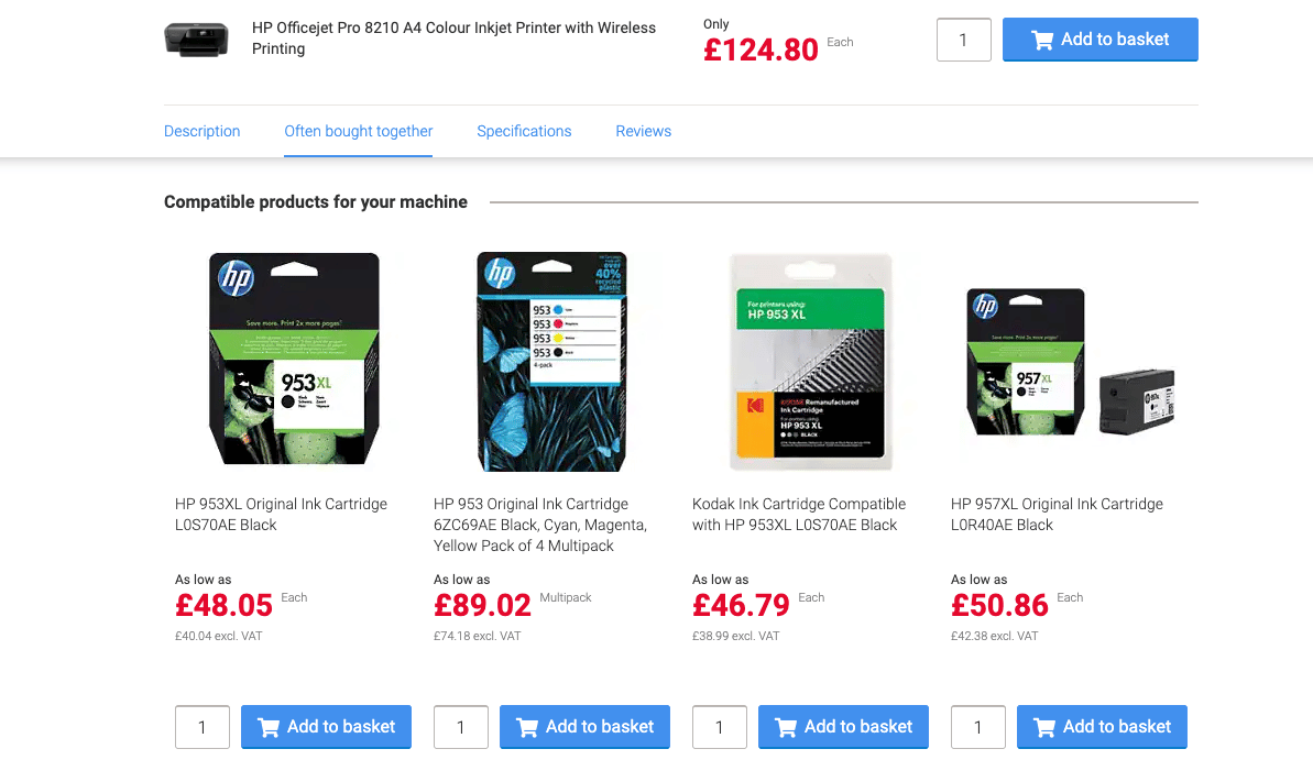 They also use advanced merchandising and purchase co-occurrence strategies to create automated product bundles on the product page. This means they are able to combine products that are complementary to each other (such as printers and inks or pencils and erasers) or frequently bought together, and show them as a bundle with a nominal price markdown to entice customers to buy the bundle and therefore increase AOVs.