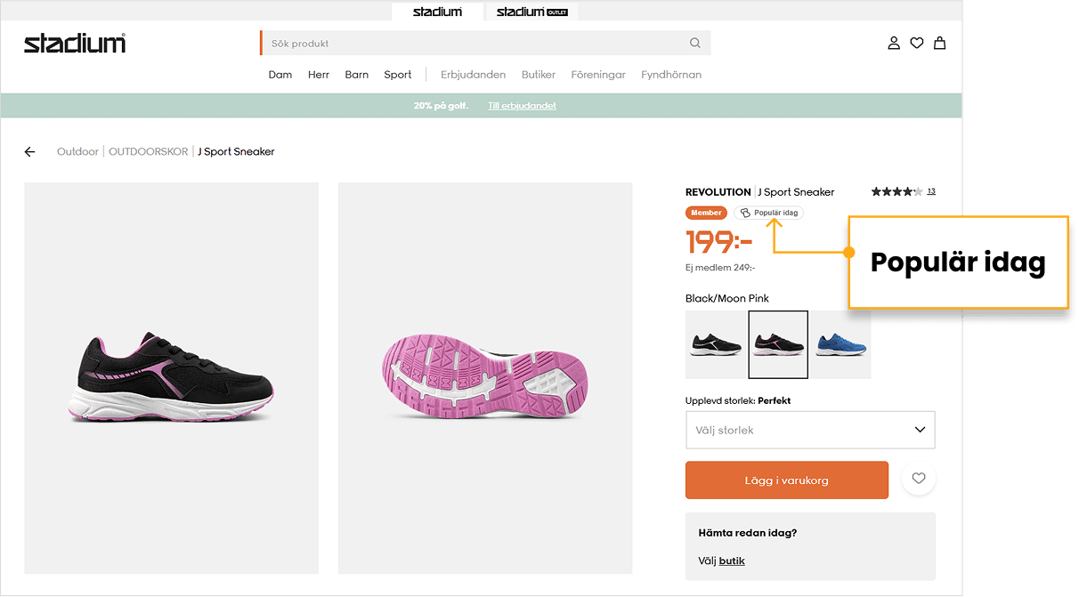 Stadium partnered with Algonomy to roll out Social Proof Messaging across item pages on all five of its Scandinavian sites—stadium.se, stadium.fi, stadiumoutlet.se, stadiumoutlet.fi, and stadiumoutlet.no.
