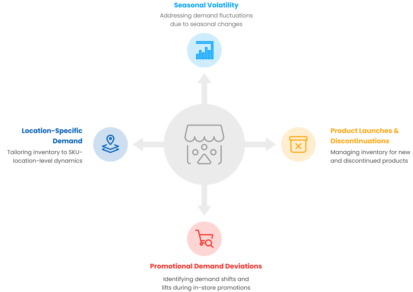 AI-driven auto-replenishment software starts from the ground level. They capture the demand at the SKU-store level, thereby making it possible to factor in multiple sales and demand influencers, like seasonal shifts, weather, events, holidays, etc.